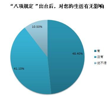 截至2013年12月20日10時,共收到網(wǎng)絡(luò)問卷2442份,48.4%的受訪者認為“八項規(guī)定”對個人生活有影響,其中公務(wù)員群體認為“八項規(guī)定”帶來的最大影響是“公務(wù)吃請少了,能抽出更多時間陪伴家人”和“津貼補貼獎金少了,勒緊褲帶過日子”,非公務(wù)員群體認為“八項規(guī)定”帶來的最大影響是“酒店、高端會所門外的公務(wù)用車少了”和“遇到領(lǐng)導(dǎo)考察工作時,地毯鮮花迎送領(lǐng)導(dǎo)的情況少了”。