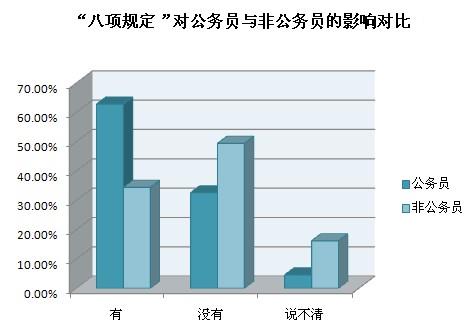 “八項規(guī)定”出臺后,對您的生活有無影響?”針對這一題,48.4%的受訪者選擇“有影響”,41.1%選擇“無影響”,10.5%“說不清”。從調(diào)查結(jié)果來看,“八項規(guī)定”對公務(wù)員群體的影響大于非公務(wù)員群體,受訪者中分別有62.8%的公務(wù)員和34.4%的非公務(wù)員選擇了“有影響”,前者比后者多28.4%。但是,回答“說不清”的比例,后者(16.2%)高于前者(4.6%),表明普通民眾相比于公務(wù)員對“八項規(guī)定”是否影響個人生活的認知相對模糊。