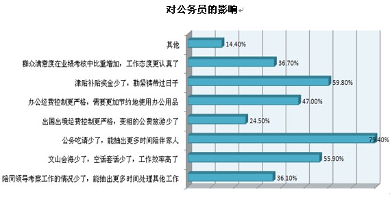“八項規(guī)定”的執(zhí)行給公務(wù)員帶來的最大影響是什么?本次調(diào)查中,排名前三位的影響依次是“公務(wù)吃請少了,能抽出更多時間陪伴家人”(79.4%)、“津貼補貼獎金少了,勒緊褲帶過日子”(59.8%)和“文山會海少了,空話套話少了,工作效率高了”(55.9%)。