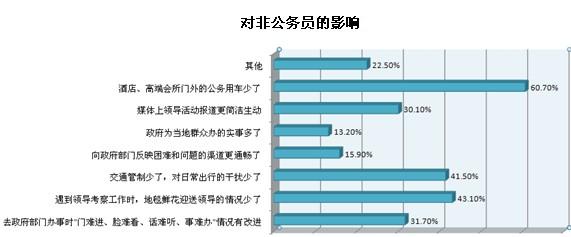 還有三到五成受訪公務(wù)員認為“辦公經(jīng)費控制更嚴格,需要更加節(jié)約地使用辦公用品”、“群眾滿意度在業(yè)績考核中比重增加,工作態(tài)度更認真了”和“陪同領(lǐng)導(dǎo)考察工作的情況少了,能抽出更多時間處理其他工作”是“八項規(guī)定”帶來的幾大影響。