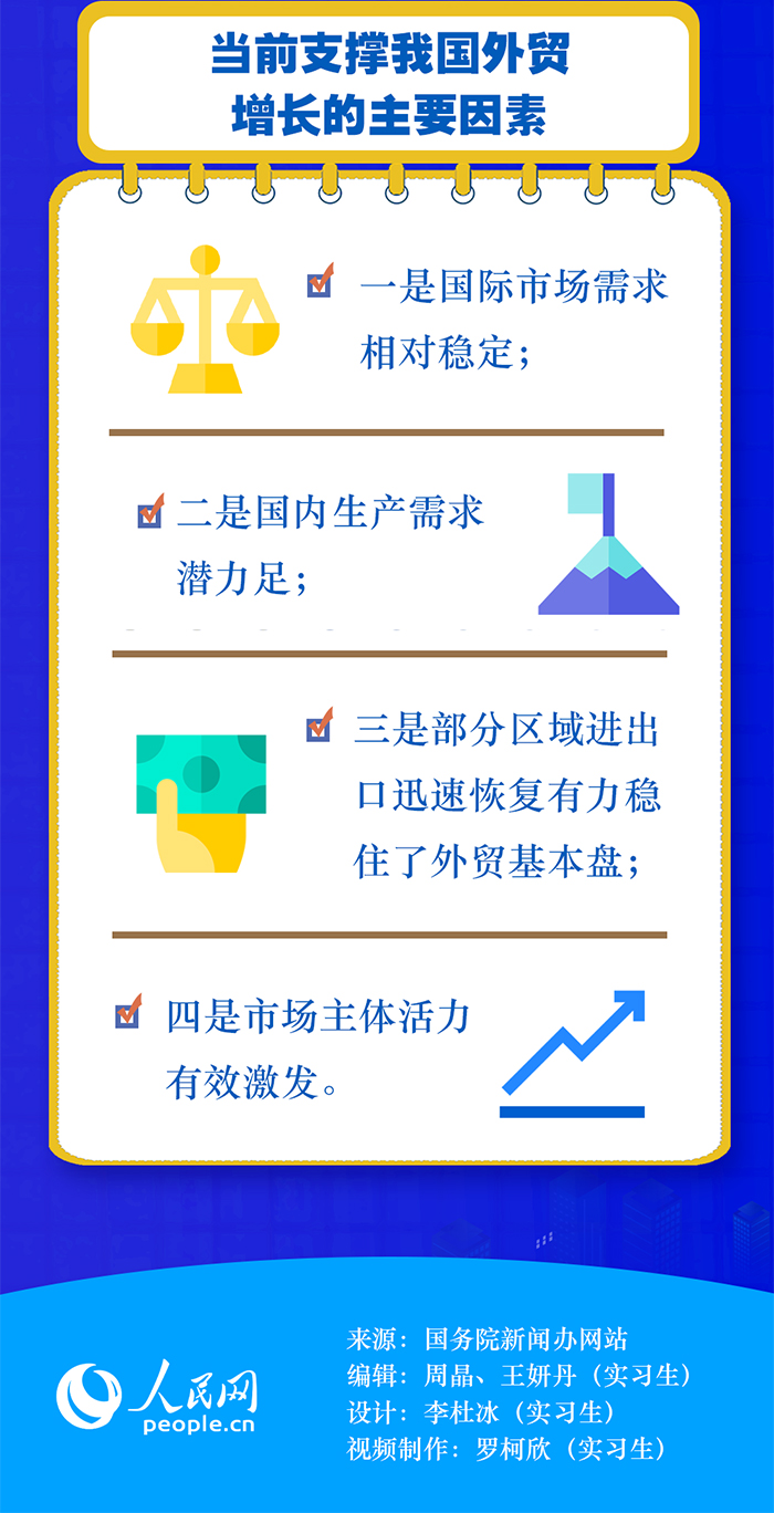 商務(wù)部原副部長魏建國在接受人民網(wǎng)“強(qiáng)觀察”欄目記者采訪時(shí)表示,上半年的外貿(mào)增長主要有三方面原因:首先,高效統(tǒng)籌疫情防控和經(jīng)濟(jì)社會(huì)發(fā)展取得實(shí)效。其次,多措并舉穩(wěn)市場主體。隨著國家穩(wěn)經(jīng)濟(jì)一攬子政策措施的落地見效,外貿(mào)保穩(wěn)提質(zhì)等各項(xiàng)工作加快推進(jìn),我國外貿(mào)市場主體活力有效激發(fā)。此外,以國內(nèi)大循環(huán)為主體、國內(nèi)國際雙循環(huán)相互促進(jìn)的新發(fā)展格局的作用正在發(fā)揮出來。