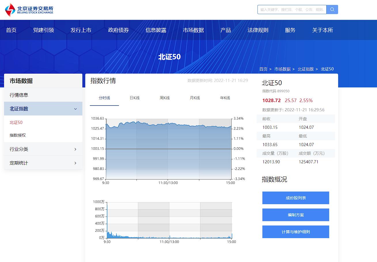 北交所首個指數——北證50成份指數(簡稱北證50)于11月21日正式發布實時行情。上線首日,北證50收盤上漲2.55%,報1028.72點,開盤后走勢平穩,樣本股成交活躍,提高了整個市場活躍度。據了解,北證50以2022年4月29日為基日,基點為1000點。