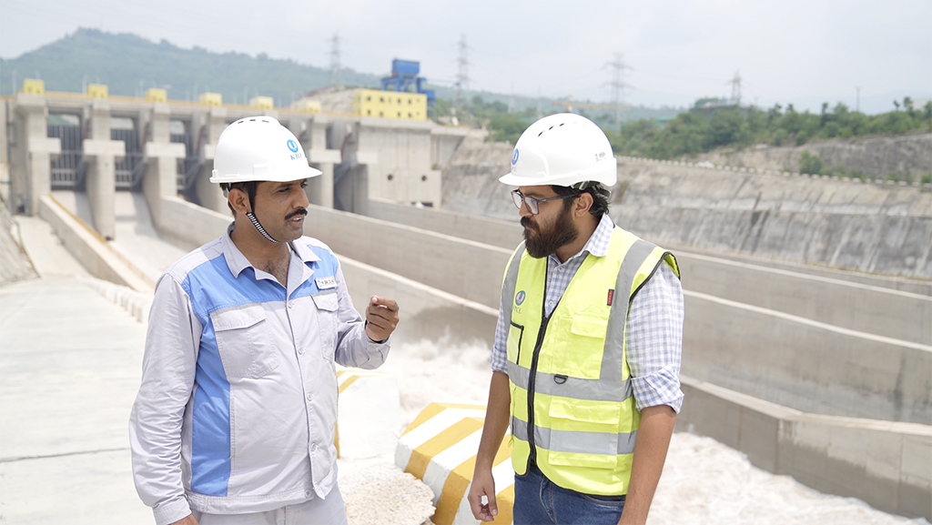 巴方員工在卡洛特水電站壩區查看水勢情況。(龍飛攝)